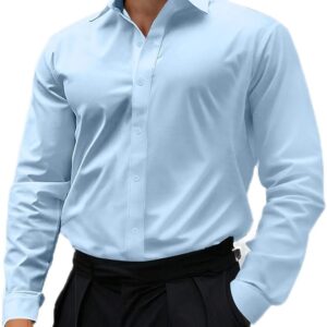 men’s long sleeve dress shirt with button-down lapel, classic fit, and stretch fabric. Wrinkle-free and comfortable for business, office, casual, party, or wedding wear. Available in UK sizes 8โ16