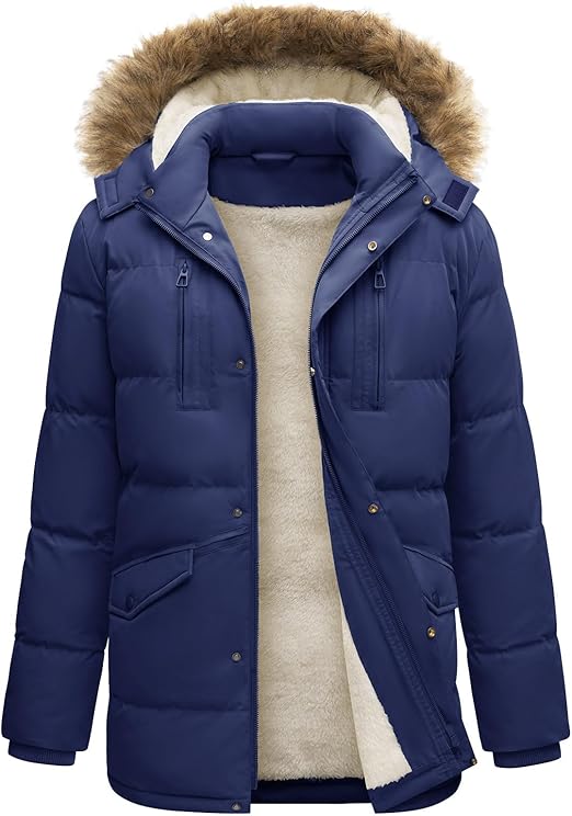 Warm Waterproof Hooded Parka Coat Made from 100% polyester, this winter coat features a water-repellent outer shell and thick cotton with fleece lining for insulation. Includes a detachable hood with snap closures, backpack-style carry straps, and multiple pockets for convenience. Ideal for daily wear and outdoor winter activities like hiking, skiing, and camping. Machine washable. Made in China.